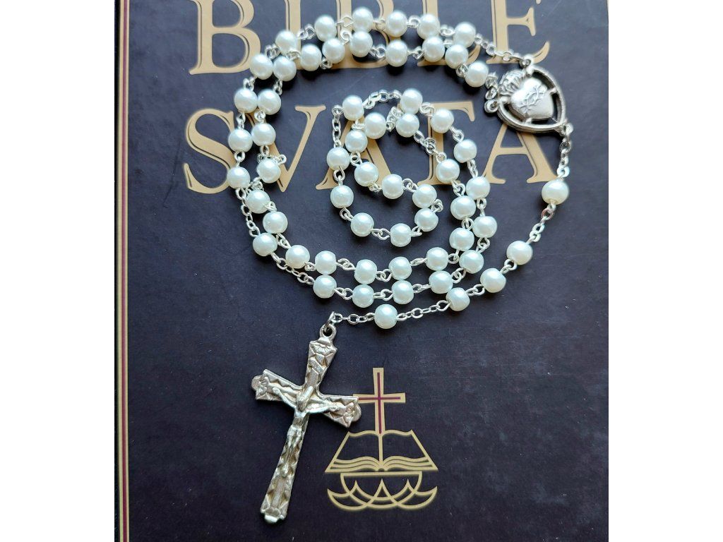 Růženec má uprostřed medailonek - srdíčko a je zakončen křížkem. Délka 42 cm. Otvor přes hlavu je 56 cm.